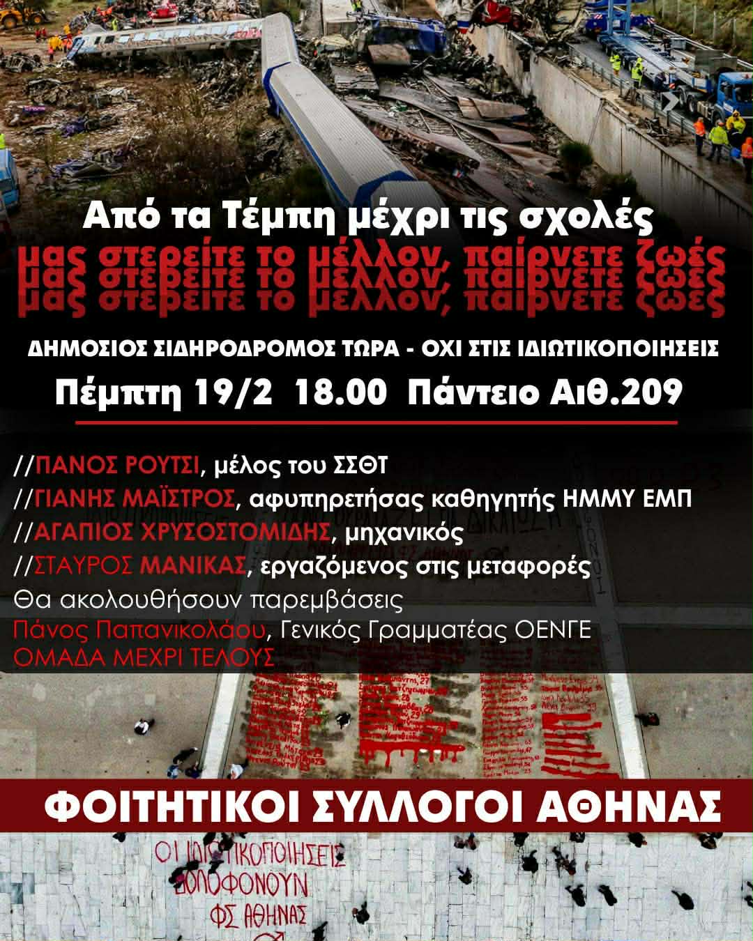 Το έγκλημα αυτό δεν ήταν ούτε ατύχημα ούτε σύμπτωση. Ήταν το προδιαγεγραμμένο αποτέλεσμα των πολιτικών ιδιωτικοποίησης, που θυσιάζει την ασφάλεια των επιβατών στον βωμό του κέρδους. Σήμερα, η προσπάθεια συγκάλυψης από την κυβέρνηση και την Hellenic Train είναι ολοφάνερη, την ώρα που ο σιδηρόδρομος συνεχίζει να λειτουργεί υπό άθλιες συνθήκες.
