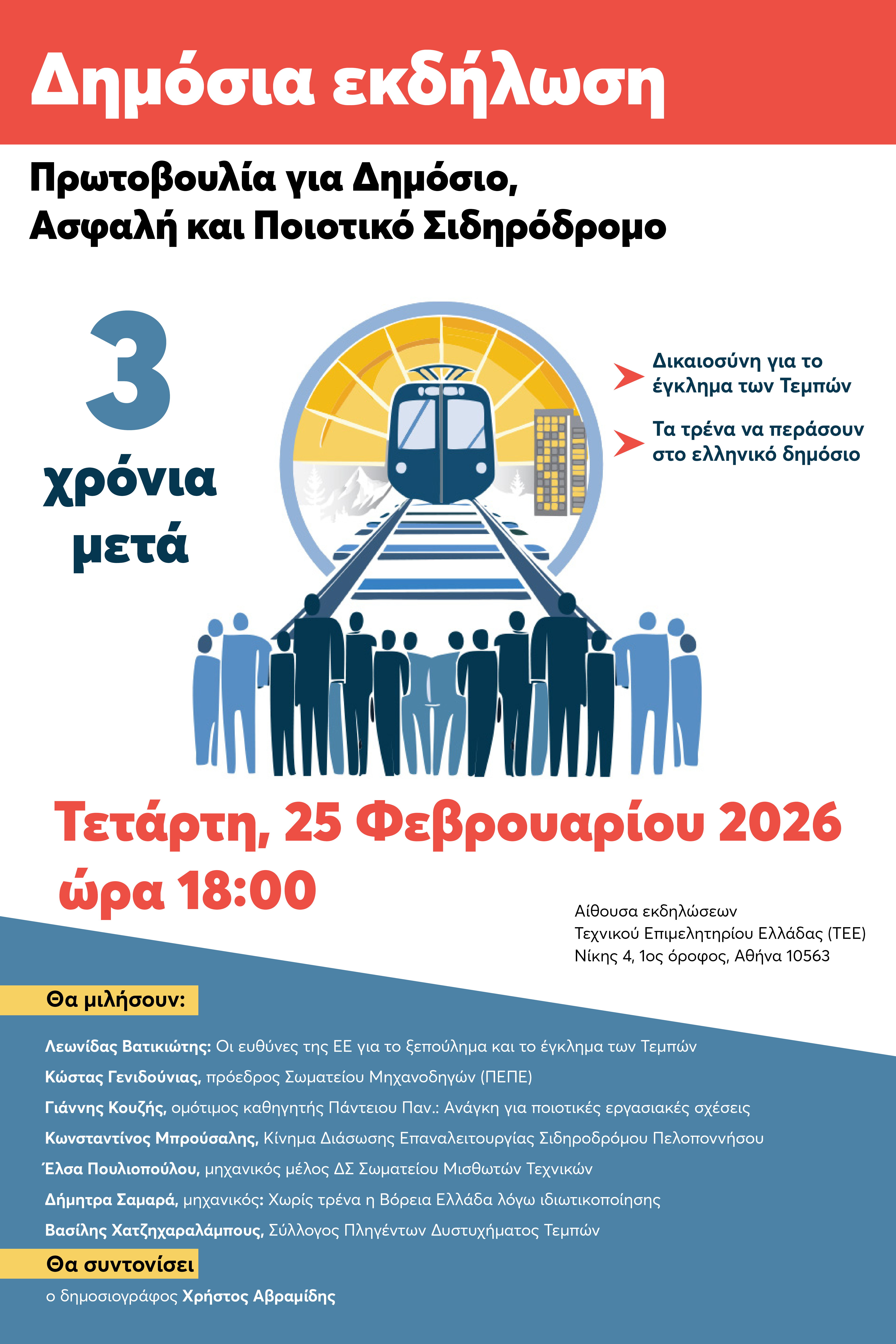 ΕΠΙΚΑΙΡΟΤΗΤΑΕκδήλωση: Τέμπη - Τρία χρόνια μετάΑπό Πρωτοβουλία για Δημόσιο, Ασφαλή και Ποιοτικό Σιδηρόδρομο, Δημοσιέυθηκε στις 2026-02-20