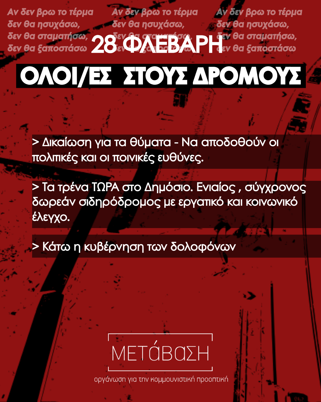 Όμως, η καταγγελία του κέρδους, όσο κι αν είναι αναγκαία, δεν φτάνει. Ο αγώνας για δικαίωση και τιμωρία χρειάζεται να συνδυαστεί με τον αγώνα για να δημιουργηθούν οι κοινωνικοί και πολιτικοί όροι ώστε να μην επαναληφθεί το έγκλημα. Για αυτό, είναι αναγκαίο, όσο ποτέ πριν, να τεθεί ψηλά το αίτημα να περάσουν οι σιδηρόδρομοι αποκλειστικά στο δημόσιο, ώστε να έχουμε ενοποιημένη επιχείρηση, ασφαλείς και σύγχρονες μεταφορές, φτηνό εισιτήριο, οικολογική λογική, επέκταση του δικτύου σε πόλεις και περιοχές.