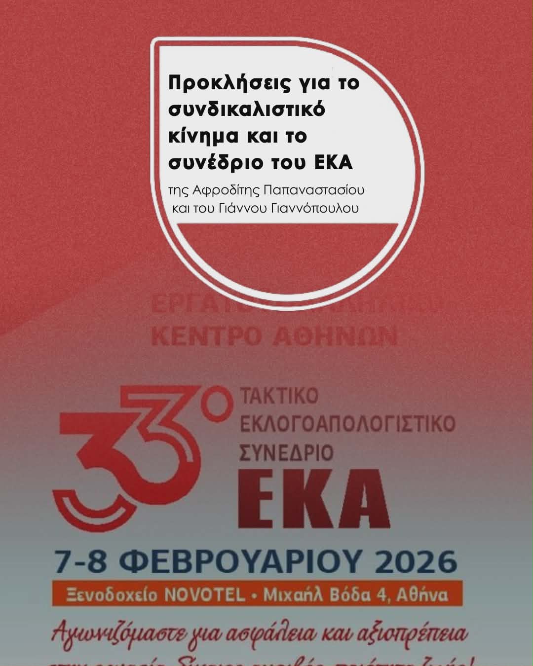 Το 33ο Συνέδριο του Εργατικού Κέντρου Αθήνας ολοκληρώθηκε στα μέσα Φεβρουαρίου, επιβεβαιώνοντας τις δυσκολίες και τις προκλήσεις πουκαλούνται να αντιμετωπίσουν τα συνδικαλιστικά ρεύματα που αναφέρονται στο μαχόμενο συνδικαλισμό στην νέα περίοδο που έχει ανοίξει μπροστά μας.