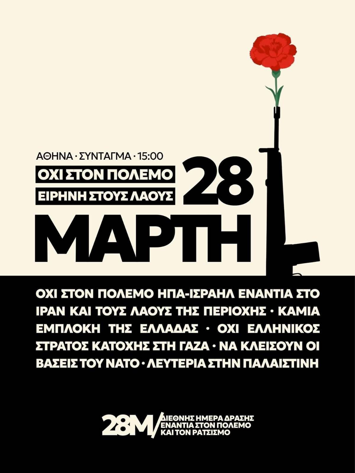 Στις 28 του Μάρτη τα συνθήματα μας να ακουστούν δυνατά, στην Ελλάδα και σε όλες τις χώρες του κόσμου: ΟΧΙ ΣΤΟΝ ΠΟΛΕΜΟ-ΕΙΡΗΝΗ ΣΤΟΥΣ ΛΑΟΥΣ