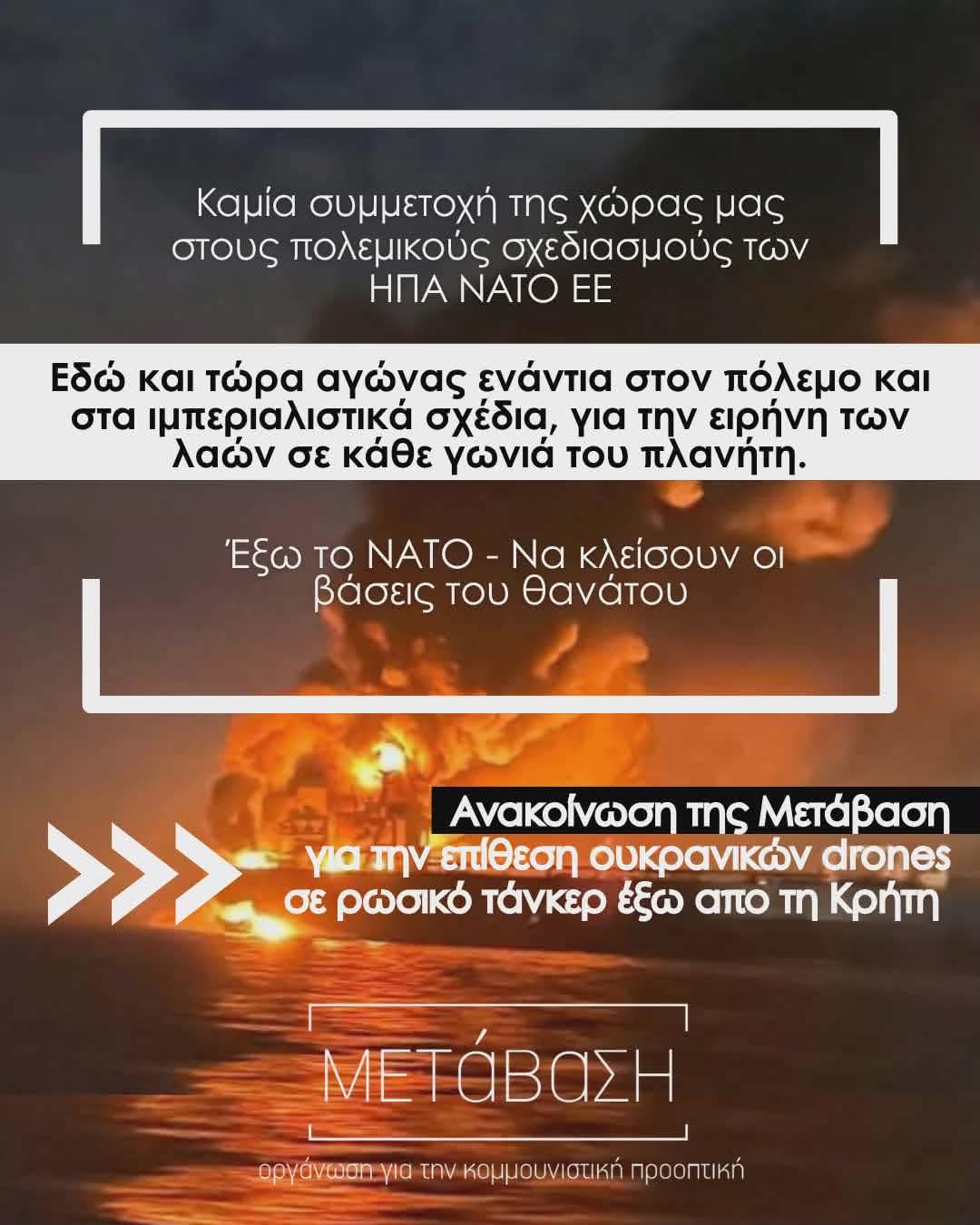 Η κυβέρνηση της ΝΔ και σύσσωμο το αστικό πολιτικό σύστημα δίνουν καθημερινά τα διαπιστευτήρια τους στον αμερικανονατοικο άξονα προσφέροντας γη και ύδωρ ειδικά στον εν εξελίξει πόλεμο στην Ουκρανία αλλά και στην γενοκτονία του παλαιστινιακού λαού. Τέτοιες ενέργειες είναι ικανές να εμπλέξουν τον λαό μας σε μεγάλους κινδύνους εντείνοντας παράλληλα την πρόσδεση της χώρας στο άρμα του ΝΑΤΟ και των ΗΠΑ.